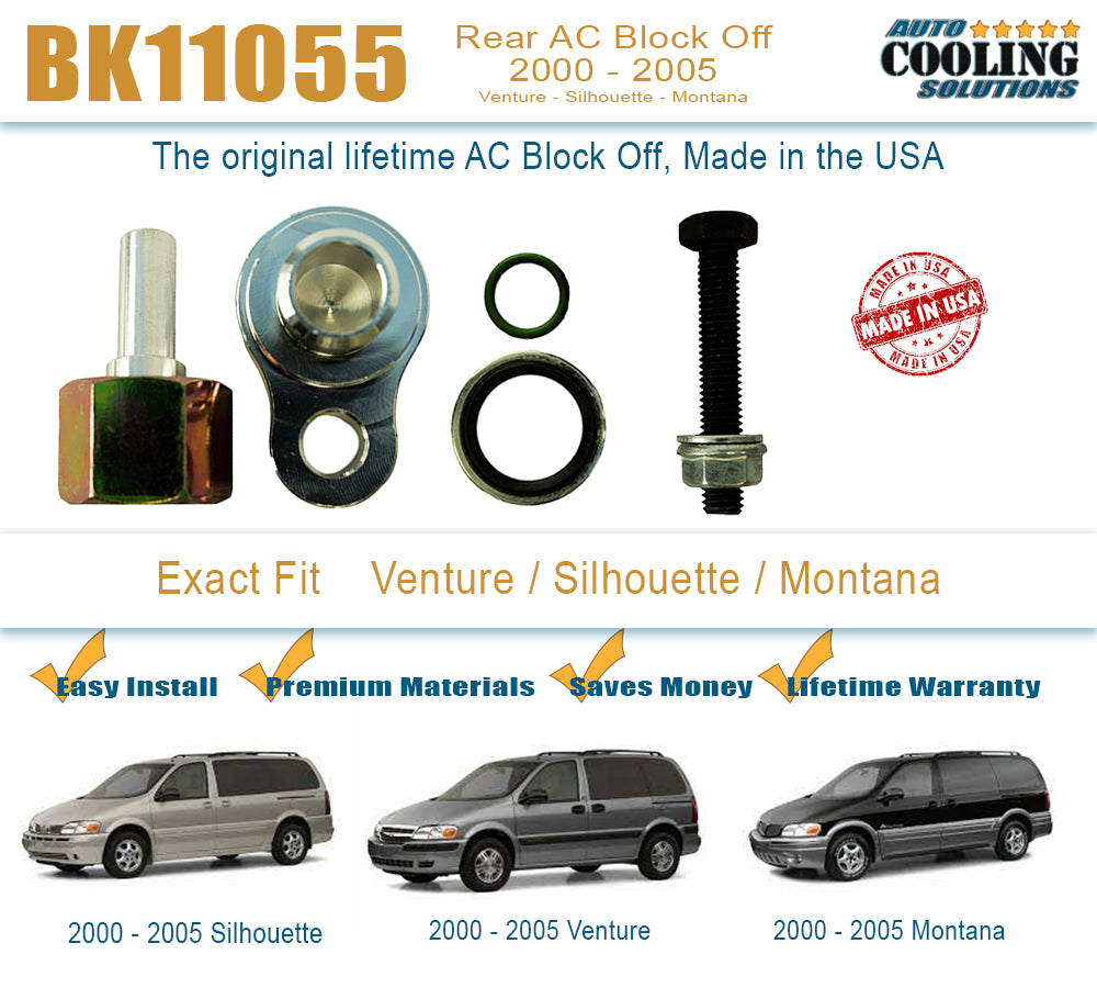 Our rear A/C block off kit allows you to block off the rear A/C lines and restore use of the front ac system. A block off kit is a workable option for some people. If your vehicle isn't used carry others around much, or if you just need a temporary solution that is more affordable than replacing the lines, a Rear AC Block Off Kit could help you "Get Your Cool Back!"